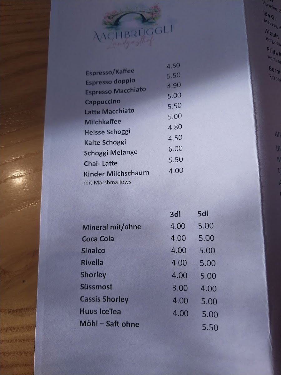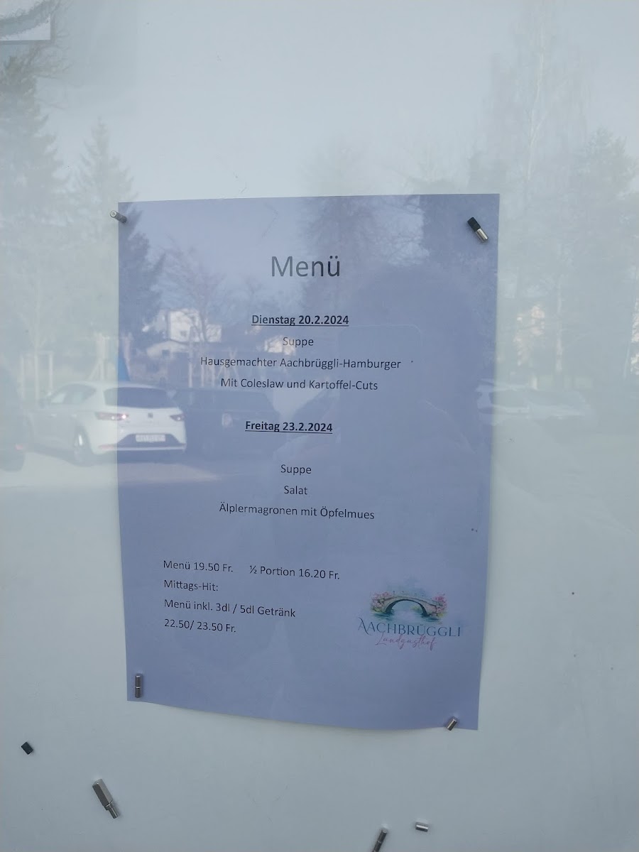 At Landgasthof Aachbrüggli, the menu offers a delightful array of hearty Swiss dishes that showcase fresh, local ingredients. Among the standout options is the Maronen, a rich chestnut-based dish that pairs beautifully with a variety of savory accompaniments. The restaurant also features a refreshing Müsli, which is perfect for those looking for a light yet satisfying meal, often complemented with freshly baked Brot (bread) to complete the experience. With such comforting offerings, the menu reflects the rustic charm of the Swiss countryside, inviting diners to indulge in classic flavors while enjoying the cozy atmosphere of this family-friendly establishment. Whether you're stopping by for a quick bite or settling in for a leisurely meal, the combination of dishes like the Maronen, Müsli, and Brot ensures a fulfilling culinary experience.